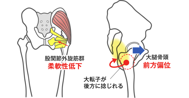 股関節外旋筋などの柔軟性が低下することにより、大腿骨の大転子が後方に捻じれて大腿骨(骨頭)が前方にズレる(前方偏位)状態となります。